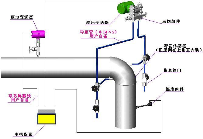 彎管流量計的系統構成 1. 測量煤氣、空氣等彎管流量計系統構成 常用的系統構成見(jiàn)下圖:(安裝圖以垂直安裝,正壓測在上)
