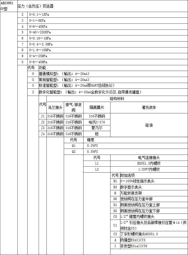 ARS3851GP電容式壓力變送器(表壓)測量最小壓力100Pa,模擬型壓力變送器最小壓力125Pa,零點(diǎn)遷移后,可以測量負壓,也可以測量開(kāi)口容器液位。使用對象:液體、氣體和蒸氣: